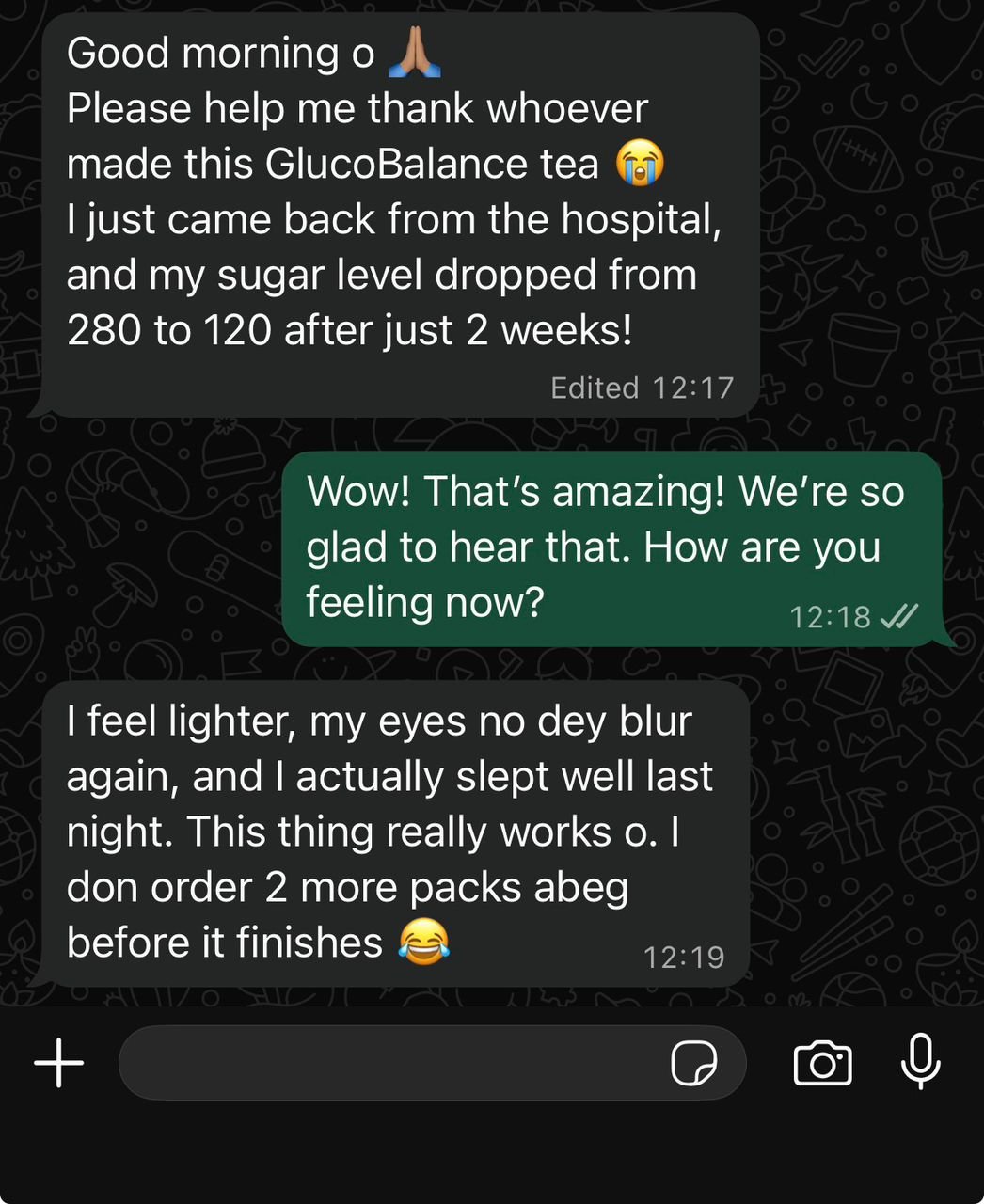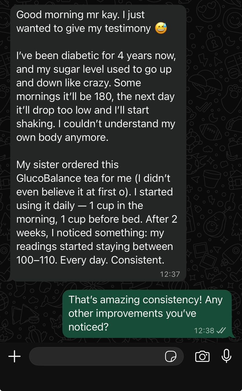 “I used to feel weak and dizzy after almost every meal. My sugar level was either too high or too low, it just wouldn’t stay steady. I started taking Gluco Balance Tea, and within two weeks, my readings became normal. Even my doctor was shocked. Now I feel stronger, more active, and no more constant fear about my sugar level.”